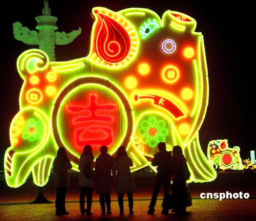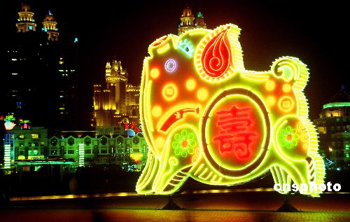 12月22日晚,在辽宁大连星海湾,5头身上分别写着“福”、“禄”、“寿”、“喜”、“吉”字样的“生肖金猪”灯饰被点燃。中新社发 王锡增 摄