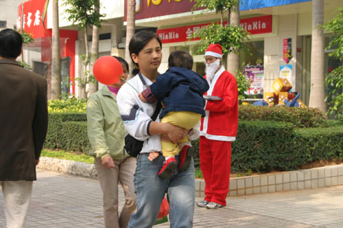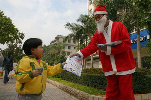 12月24日,广东湛江一青年装扮成圣诞老人的模样, 在市区繁华街道向过往行人派发圣诞礼物“广告”, 这一招吸引不少小朋友驻足讨要。 (图文韩海冰)