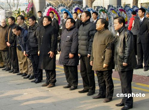十二月二十四日,著名相声表演艺术家马季遗体告别仪式在北京八宝山人民公墓举行,众弟子姜昆、黄宏、冯巩、刘伟、笑林等到场送别恩师,并在告别厅外一字排开鞠躬感谢前来送别马季先生的民众。中新社发 廖攀 摄