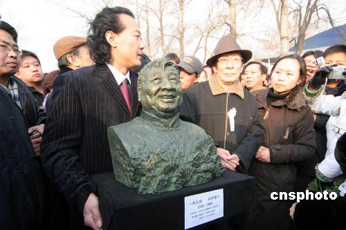 2006年12月24日,马季追悼会在北京八宝山举行。一位雕像家赠送他创作的特别雕像给马季家人,表达哀思。中新社发 吴芒子 摄