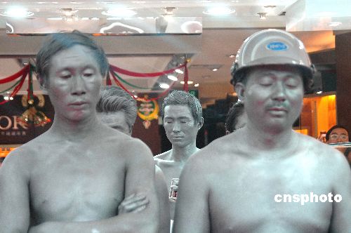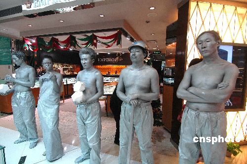 12月24日,绝色佳人掘宝藏行为艺术展在杭州大厦隆重开幕,6位青年男女将自己全身染成银白色展示挖掘宝藏的钻石开采、钻石形成等各个程序。中新社发 引炜 摄