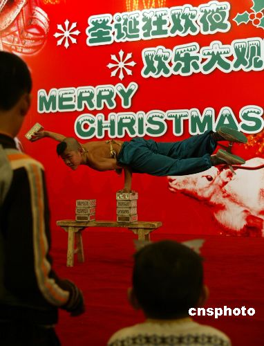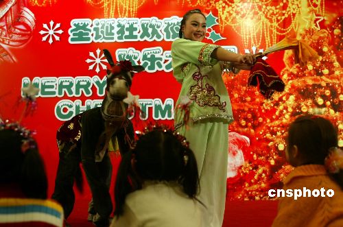 圣诞节前夜,北京小朋友在大观园戏楼观看北京天桥艺人表演的民俗文艺节目,迎接圣诞节的到来。中新社发 杨可佳 摄
