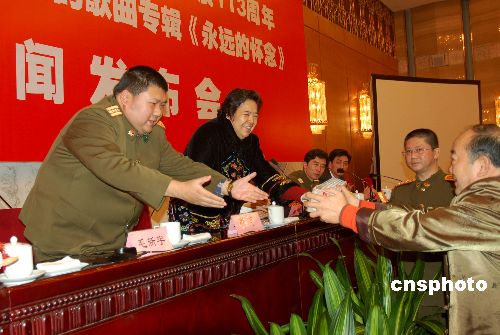 十二月二十五日,一部由毛岸青、邵华作词,宋祖英等众歌星倾情演绎的缅怀开国领袖毛泽东的歌曲专辑《永远的怀念》在人民大会堂举行首发式,邵华和毛新宇代表毛家亲属出席了发布会。图为邵华(左二)与毛新宇(左一)接受著名横写倒书书法家王斌(右一)赠送的纪念毛泽东书法作品。中新社发 张量 摄