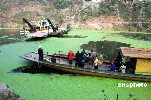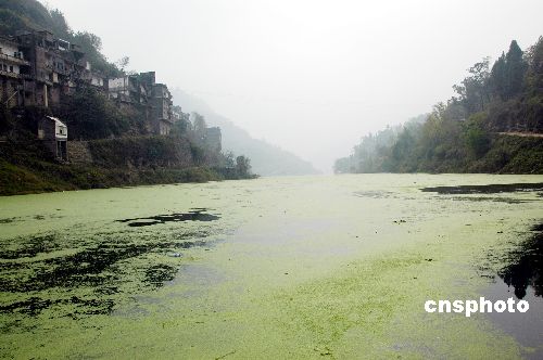 12月中旬,重庆云阳库区污染加重,从三峡完成156米蓄水以来,长江水基本处于静止状态,流域部分支流长满浮藻,个别河段已经封河,给人畜饮水和航运运输带来很大安全隐患。中新社发 摄欲 摄