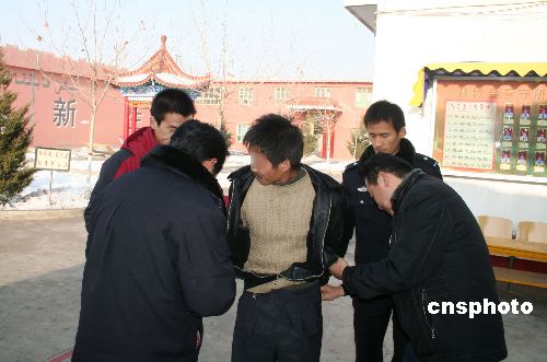 12月25日,持枪杀人后被公安部网上通缉的犯嫌疑人刘某被警方押解回安徽。2002年因矛盾刘某在安徽省太和县老家持枪杀害一人并潜逃新疆,隐姓埋名企图逃避警方打击。据了解,这已是新疆拜城县公安局今年以来抓获的第21名网上逃犯。中新社发 崔玉永 摄