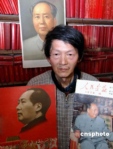 12月26日,福建收藏家黄世钦为慕名前来的收藏爱好者介绍他十多年间收藏的一万多件有关毛泽东的图片、画报、文选、海报、连环画等文献藏品。今年12月26日是中国一代伟人毛泽东诞辰113周年纪念日。中新社发 刘可耕 摄