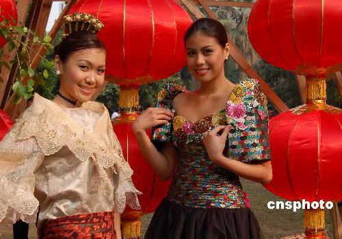 十二月二十七日,两位身着艳丽民族服饰的菲律宾女孩在广西南宁以中国红灯笼为背景拍摄外景。当日,广西电视台“寻找金花”节目组把中国和东盟的“金花”邀请到南宁聚会,展现她们的精彩和美丽,促进各国文化交流。中新社发 林艳华 摄