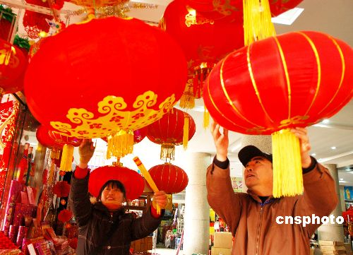 12月30日,顾客在扬州市曲江小商品市场选购灯笼。新年临近,吉祥、喜庆的节日饰品在扬州热销。中新社发 张丙涛 摄
