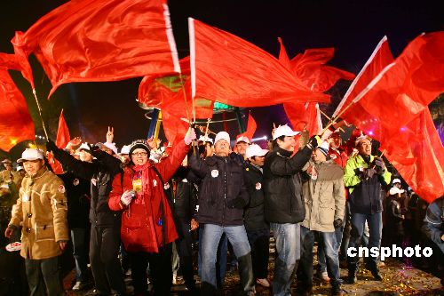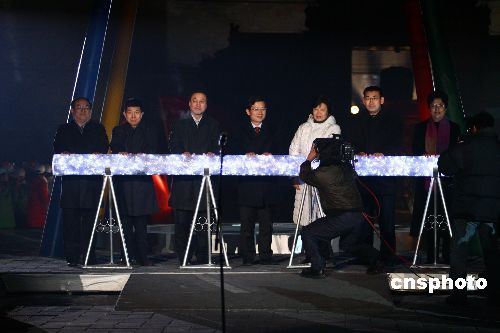 2007年1月1日凌晨,奥运志愿“微笑圈”正式版发布仪式暨“我们在钟鼓楼传递微笑”大型主题宣传活动在北京钟鼓楼盛大举行。正式版的奥运志愿“微笑圈”将成为奥运志愿服务和承诺的标志,随奥运志愿服务一起通向2008年。中新社发 飞常郝 摄