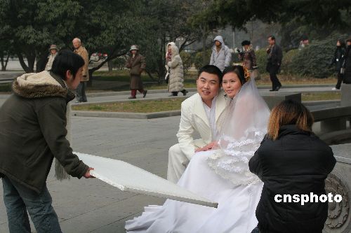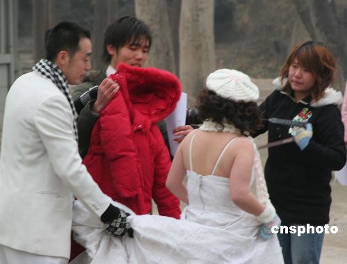 2007年1月2日,尽管古城西安气温降至零下,但仍未能挡住户外拍摄婚纱照的热潮。元旦期间,一些新人为了搭上2007年的早班车,不顾冬日的严寒,纷纷来到户外拍摄婚纱照。新人们穿着的单薄衣衫和游人们穿着的厚重棉衣形成了鲜明的对比。中新社发 王振001 摄