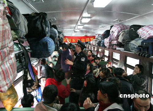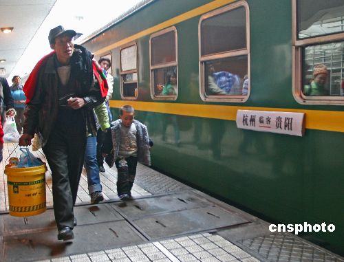 1月5日,杭州2007年首趟春运前临客“民工专列”L199次满载1300多名旅客准时从杭州站发车,开往贵阳。搭乘L199次列车的主要是四川民工,这趟列车共编组18辆,开行普通旅客列车,硬座票价比新空车便宜65元。中新社发 陈加华 摄