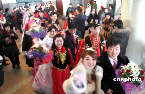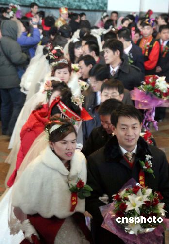 1月8日,28对来自不同城市的新人在哈尔滨市松花江畔的防洪纪念塔下举行冰上集体婚礼。中新社发 王忠言 摄