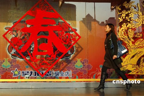 1月9日,时值寒冬,贵州贵阳大西门一商家以剪纸“春”字布景迎新。中新社发 吴东俊 摄