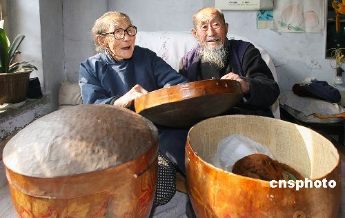 1月10日,结婚80周年的俩位百岁老人展示结婚时亲手制作的盛米用的纸缸。当日,大连市瓦房店100岁的孟庆荣老人和101岁的原配夫人孟倪氏,在家中展示80年前俩人结婚时亲手制作的结婚纪念品—纸缸。俩位老寿星都是大连市瓦房店人,于1927年结婚,俩人相依相偎,风风雨雨共同走过了80个春秋。育有三子两女,五世同堂,恩爱如初,在当地传为佳话。中新社发 卢沙 摄