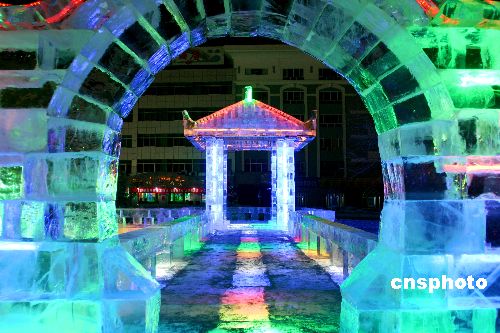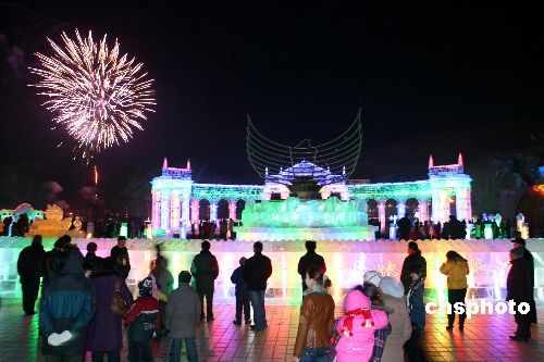 1月16日,游客在观赏冰雕。新疆最大的冰雕园在素有“人类最早滑雪起源地”之称的阿勒泰市开园。这座冰雕园用冰2950立方米,共雕刻了20组35件作品。每个冰雕做工精湛、气势恢宏、栩栩如生,成为新疆阿勒泰第四届冰雪风情游的“金字招牌”。中新社发 刘新海 摄