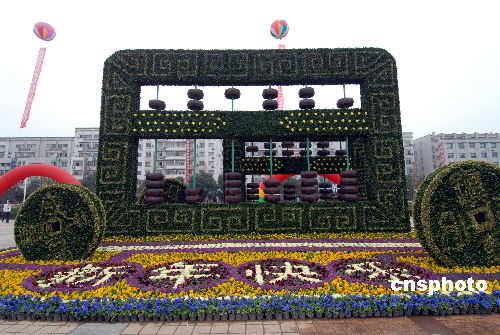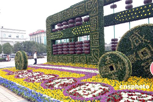 2007年1月18日上午,浙江台州路桥永安广场上高达七八米的两把“算盘”和直径近两米的铜钱花雕吸引了市民驻足观看。浙江台州市路桥区园林处采用苗木制成“算盘”周围配上鲜花摆成的“新年快乐、打造现代商贸城”等字样,为新年的路桥增添喜庆气氛。据了解,这个“算盘”是50多人花了半个月时间制作的。中新社发 华文武 摄