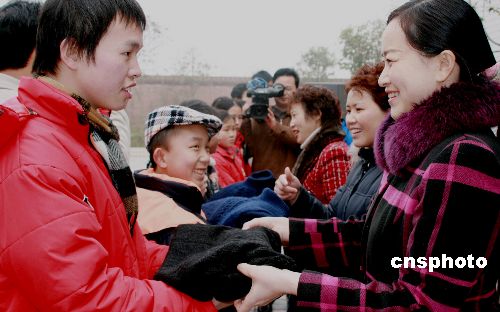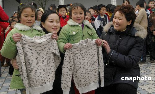 2007年1月19日,四川省广安特殊教育学校的孤残儿童喜滋滋地收到由“爱心妈妈”编织的毛衣。当日,广安市广安区妇联组织的100名“爱心妈妈”将亲手织成的毛衣分别送给162名孤残疾儿童,使孤儿和残疾儿童感受到温暖和关爱。中新社发 邱海鹰 摄