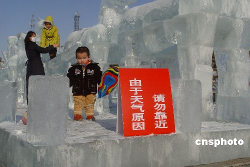 1月21日,在阿勒泰市金山广场欣赏冰雕的游客被工作人员告知不要靠近冰雕以免造成生命危险。据了解,当日阿勒泰最高气温达到零下7度,路上的积雪旋即融化,冰雕作品也开始出现融化现象,相关部门紧急打出了“由于天气原因请勿靠近”的安全提示牌。中新社发 张秀科 摄