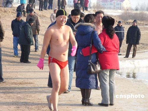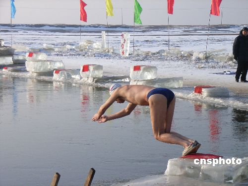 1月21日,在黑龙江齐齐哈尔嫩江段,冬泳爱好者跳进冰冷刺骨的江水中。进入腊月,该市冬泳爱好者一直坚持每天冬泳,锻炼身体和意志。中新社发 王云龙 摄