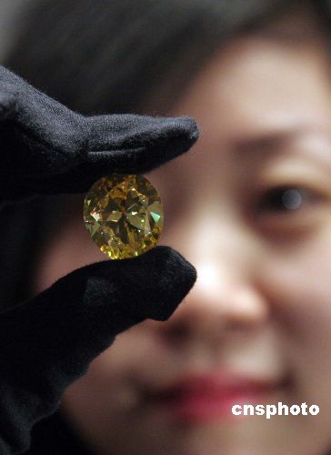 1月22日,一颗价值888万元、重达30克拉的黄色钻石在HIERSUN首届钻石文化节的哈尔滨红博世纪广场隆重展出。据此次HIERSUN钻石文化节负责人徐燕介绍,10万颗宝石级钻石中,才能发现一颗彩色钻石,重达30克拉的彩钻更是罕见。中新社发 王忠言 摄