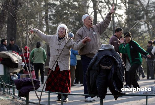 一月二十三日,一些老人在北京紫竹院公园跳舞健身。当日是“四九”第七天,北京天气仍处于3℃~-4℃之间,保持了今年以来的暖冬势头。中新社发 武仲林 摄