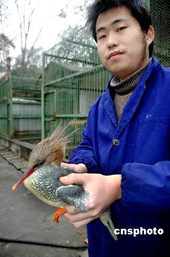 一月二十三日,南昌市动物园工作人员正准备给“国宝”中华秋沙鸭做检查。一只受伤的国际濒危动物——中华秋沙鸭日前被江西德兴一市民“解救”,送到南昌动物园救治后,引起了南昌市民的极大关注。中华秋沙鸭是中国特有鸟类,全球目前仅存不足一千只,属国家一级保护动物,比大熊猫还珍贵。英国人于一八六四年在中国采到一只雄性幼鸭标本,并将其命名为“中华秋沙鸭”。中新社发 段长征 摄