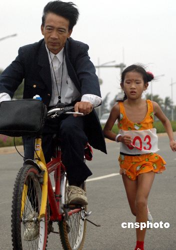 1月24日,海南省临高县8岁女孩张慧敏开始了她的环海南岛长跑之旅。据其父亲介绍,张慧敏长跑路线是从临高县到海口,然后从东线到三亚市,再从西线跑回临高,全程800多公里,计划每天跑60公里,保持每小时8公里的时速,用15天左右时间。据气象部门透露近日气温会时降时升,而且长途不停地跑对孩子体能等方面都是个严峻的考验,因此这场挑战面临太多的未知数。中新社发 善平 摄