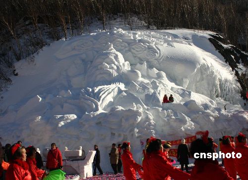 历时半年的长白山雪文化节于二OO七年一月二十四日开幕,本次雪文化节以长白山自然文化、神话文化和历史民俗为题材,制作了巨型雪雕群组,总用雪量达十万立方米,是亚洲最大的雪雕群。另外,在长白山景区还设置了多种多样的冰雪娱乐设施和娱乐项目,使游客体会到冰雪带来的无穷乐趣,以及与冰雪为伴的清新自然。中新社发 宁秀英 摄