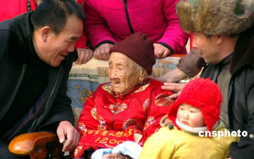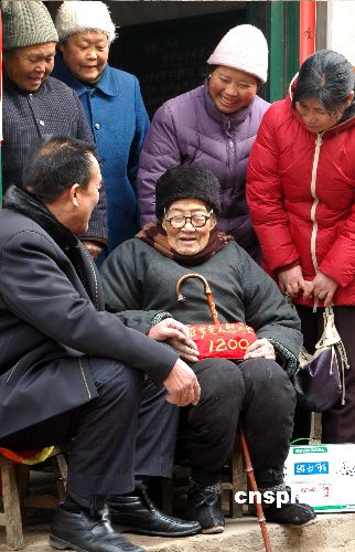1月25日,山东郯城县马头镇百岁老人魏刘氏领到政府增发的1200元“长寿补贴金”。日前,山东省决定,对全省2500多名百岁老人每人每月增发100元的长寿补贴金,资金全部由省财政负担。目前,289万元专项资金已下拨到各地市,并于2007年春节前发放到每位百岁老人手中。中新社发 房德华 摄