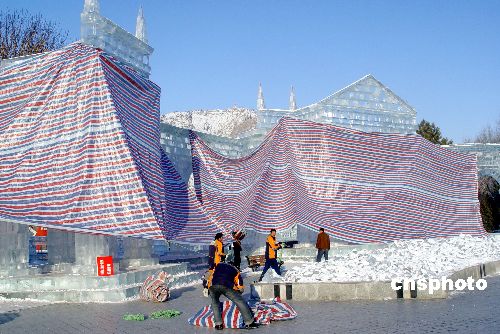 1月28日,新疆阿勒泰市冰雕园的的工作人员正在给冰雕作品挂遮阳布。据悉,阿勒泰当日白天气温是零上3摄氏度,未来几天气温还将上升4—8摄氏度。中新社发 张秀科 摄