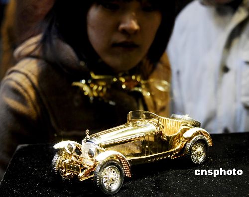 2007年1月28日,在国家级十大师联展暨中国金属艺术精品展上,一辆由黄金、珠宝、钻石打造一身的“老爷车”现身杭州。据悉,该次展览是由国内11位中国工艺美术大师携各自设计制作的金属类工艺美术精品参展,共展示了十大类200余件作品。中新社发 黄正胜 摄