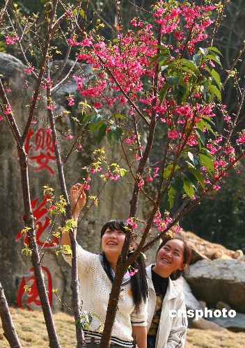 1月28日,由于暖冬,福建福州国家森林公园“樱花园”的樱花提前开放,许多市民前来观赏。据介绍,“樱花园”有500多株樱花,种植于2006年10月,有3个品种:福建山樱花、台湾山樱花和日本樱花。中新社发 祝敏松 摄