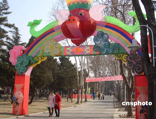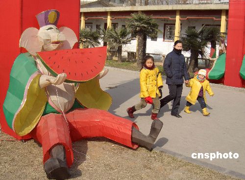 2007年1月29日,“猪八戒吃西瓜”花灯吸引许多小朋友来观看。当日,山东枣庄市人民公园举办以生肖猪为主要内容的迎春灯会开始免费向市民展出,为即将来临的春节增添了喜庆气氛。中新社发 吉喆 摄