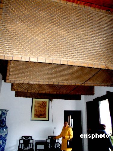 1月29日,一名游客拉动绳子,体验古代竹编“吊扇”。 一款独特的清代竹编“吊扇”在江西省婺源县严田古樟民俗园亮相。“吊扇”悬梁而挂,人们只要拉动连接“扇页”的绳子,便可感受到阵阵凉风。中新社发 王国红 摄