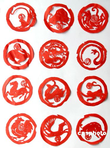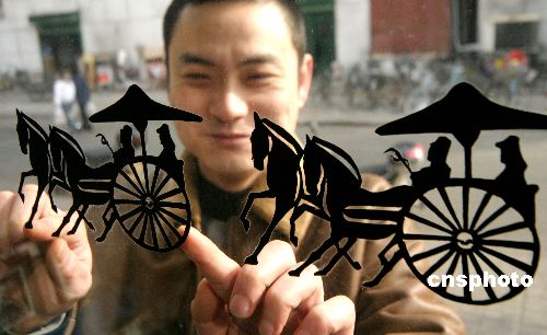 2007年1月31日,剪纸艺人在张贴富有汉代民俗风情的剪纸。河南省许昌市青年剪纸艺人吴震从大量汉代实用美术中吸取艺术营养,将汉代民俗风情运用剪纸艺术形象表现出来,剪出一系列体现汉代民俗风情的剪纸艺术作品。中新社发 牛书培 摄