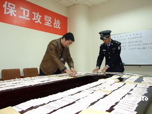 元月31日,广州铁路警方再次亮剑,出动50名警力,兵分三路,在广州市越秀区一出租屋内端掉一制假窝点,当场抓获涉案嫌疑人10名,缴获成品和半成品假火车票1776张,票面价值40余万元,缴获一大批刀片、铅字、刻刀、药水等制假工具。中新社发 丁勇 摄