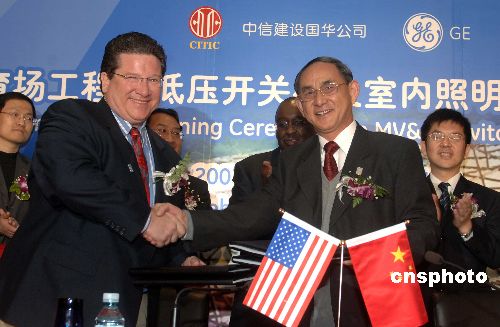 二月二日,美国通用电气公司与中信建设国华公司签署了国家体育场工程高低压开关柜采购及室内灯具采购合同,总金额为二千六百五十万元人民币。图为通用电气消费及工业产品集团大中华区总裁金飞翔(左)与中信建设国华公司副董事长皮尤新签约后握手。中新社发 张宇 摄