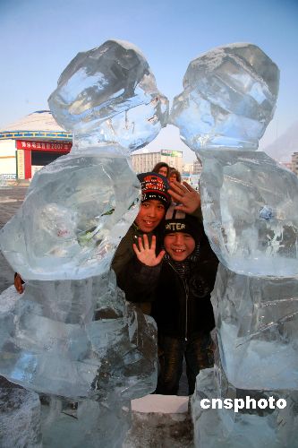 2月2日,一批批游人走进新疆博乐市西部文化广场,观看冰雕作品。近日由新疆博尔塔拉蒙古自治州举办的首府迎新春冰雕展,成为冬日里的一道亮丽风景线,每天吸引着众多游人前来观赏。中新社发 胡维斌 摄