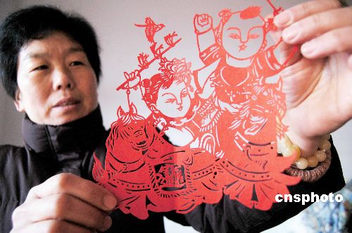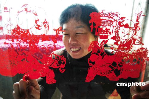 2月2日,河南淮阳县民间剪纸艺人王金梅在展示她刻制的年画剪纸作品。过年贴对联,粘窗花,是我国传统的迎春方式,王金梅以剪纸的艺术形式把传统的年画作品刻制出来,赠送给亲朋好友。她的刻纸年画构图丰满,线条细腻,趣味性强,为欢乐祥和的春节增添了喜庆的氛围,成为辞旧迎新,履吉纳福的艺术品。中新社发 杨正华 摄
