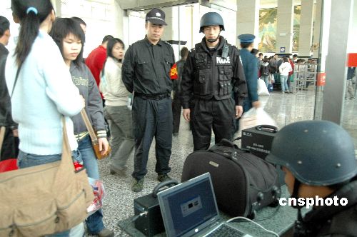 二月三日,广西南宁铁路警方为确保春运安全,采用新式查危防爆仪器便携式闪光X射线检查仪。中新社发 蒋雪林 摄