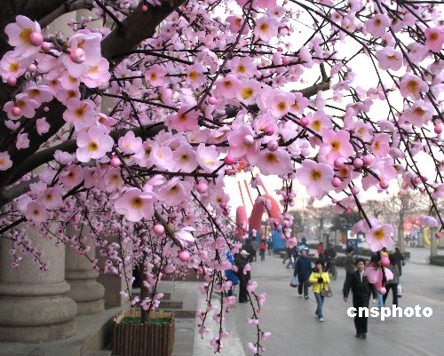 2月5日,济南泉城路西端一商家门口“桃花”盛开,营造出一片热闹的新春佳节气氛。许多顾客近距离观赏,才发现是逼真的绢花。临近春节,济南街头已经多了一份热闹的新春气象。中新社发 周青先 摄