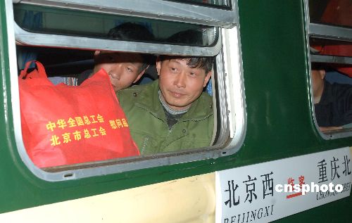 2月5日23:24分,农民工专列临客L219次(北京至重庆北)正点从北京西站出发返回湖北老家。乘坐此次专列的1260名返乡农民是北京奥运工程、首都机场、北京南站等重点项目的建设者。中新社发 邹宪 摄
