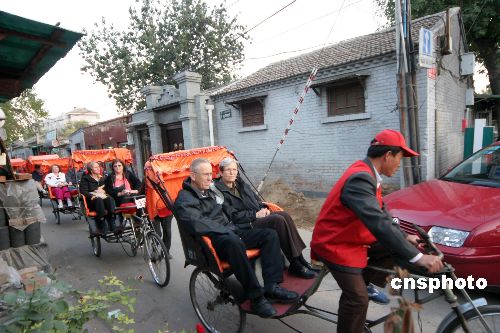 图为游客乘坐三轮车游览北京胡同。2007年2月6日,北京市西城区拟投资数千万元在什刹海景区推行“一卡通”。“一卡通”不仅可作为电子门票使用,还能有效防止“黑导游”欺诈游客。中新社发 吴芒子 摄