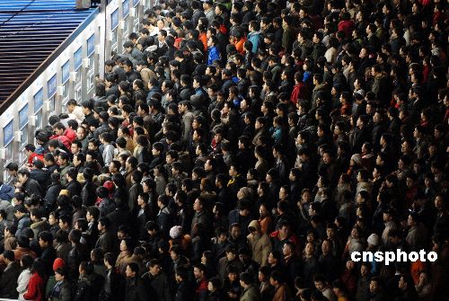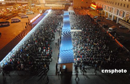 2007年2月6日晚7时许,北京西站售票广场,聚满了排队购票的旅客。春运进入第四天,北京西站迎来购票高峰。中新社发 吕家佐 摄