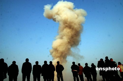 2月8日,沈阳市公安局治安警察支队在新城子区石佛寺乡沙岗子村辽河河套内,用烧毁的方法,销毁近期公安机关罚没的和沈阳市烟花爆竹生产经营单位废旧的烟花爆竹,总计3200余件,价值40余万元。 中新社发 黄金昆 摄