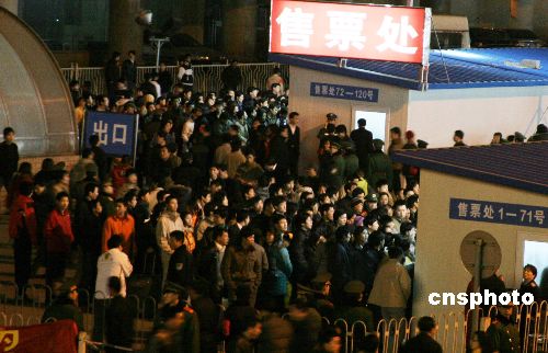 2007年2月8日晚7时许,北京西站售票广场聚满排队购票的旅客。春运进入第6天,北京西站迎来购票高峰。中新社发 吴芒子 摄