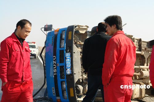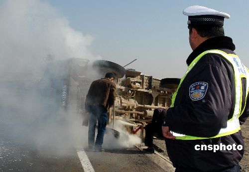 2月9日中午13:40分,在312国道3906公里+200米处的新疆鄯善县至吐鲁番市路段发生一起重大交通事故,车上四名吐哈油田石油勘探部门的工作人员,被及时赶到的鄯善县公安交警和过往人员救援下全部获救,失事车辆也未被大火烧毁。事故原因在进一步调查中。中新社发 姜浩 摄