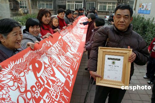 2月9日,在济南市市中区普利街社区,残疾人姜华展示自己的剪纸作品和获得的由上海大世界基尼斯总部颁发的“世界最长的剪纸——200.8米”证书。姜华今年46岁,四肢三残,只有左腿完全健康,自2003年3月22日开始,历时3年零8个月制作的成长200.8米、宽0.662米的“2008年奥运会剪纸长卷”,作品中包含了北京奥运会28个大项、302个小项的所有比赛项目。中新社发 龚辉 摄