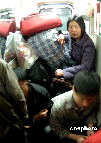 2月10日,从北京开往重庆的T9次列车上,硬座车厢人满为患,夜晚车厢洗漱间挤满了没有座位的乘客以及行李。中新社发 廖攀 摄