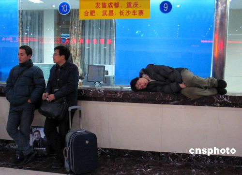 2月10日凌晨1时许,有些旅客为买到返乡火车票,竟然睡在北京站售票窗口边台上。中新社发 吴芒子 摄